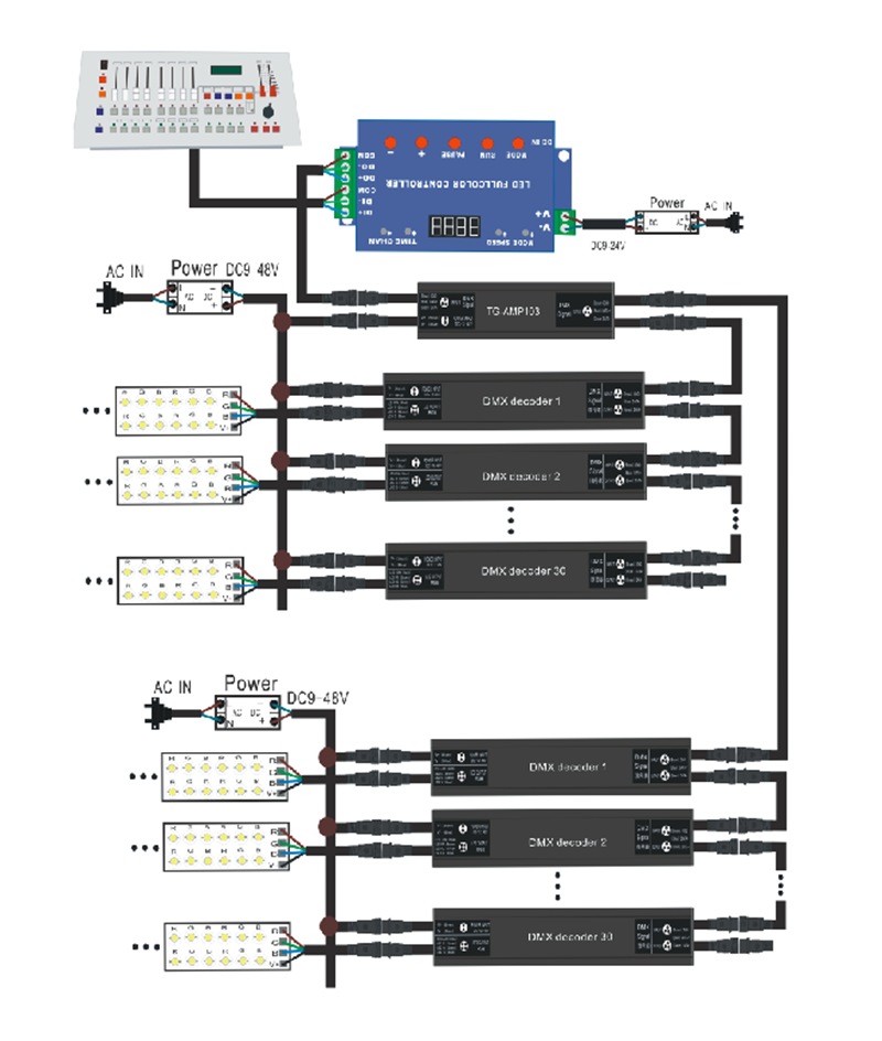 五.安装图DMX512控制器与解码器及灯具的连接方式