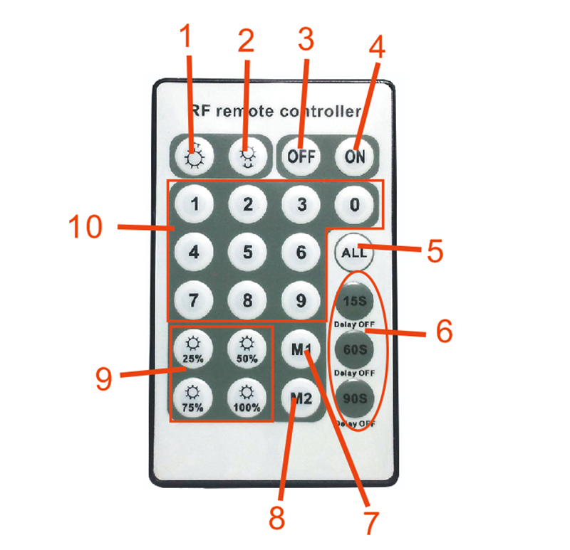 2.亮度- 3.关闭键 4.打开键 5.全选 6.延时关灯 7.模式1 8.模式2 9.4种亮度快速选择功能 10.分组数字键