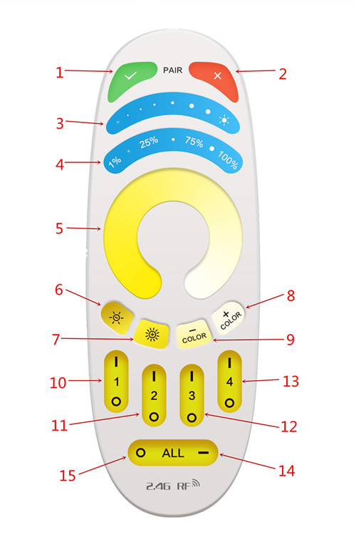 1.按1次,WiFi处于STA模式,WiFi配对键,当遥控器与灯具配对时任意时间连续按4次, WiFi进入与路由器配对模式 2.灯具打开电源20秒内,连接按3次,删除灯具与路由器的配对功能;灯具处理AP模式(热点模式)时,在手机上可以查到WiFi名称 3.亮度调节 4.亮度调节, 4个等级 5. 色温控制 6.亮度 -